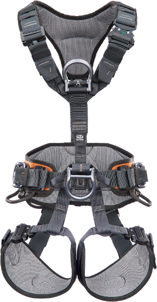 Seitliche EN-358-Befestigungspunkte lassen sich bei Nichtgebrauch einklappen. Ein sternaler und ein dorsaler Anschlagpunkt nach EN 361 sowie ein rückseitiger Rückhaltepunkt (R) ermöglichen flexible Anwendung. Weitere Ausstattungen: Ösen für Bruststeigklemme und Sitz, Riemen für HOOK REST, vier große Materialhalter, sechs Werkzeugösen und vier Schlaufen für Karabiner. Maximale Belastung: 140 kg.