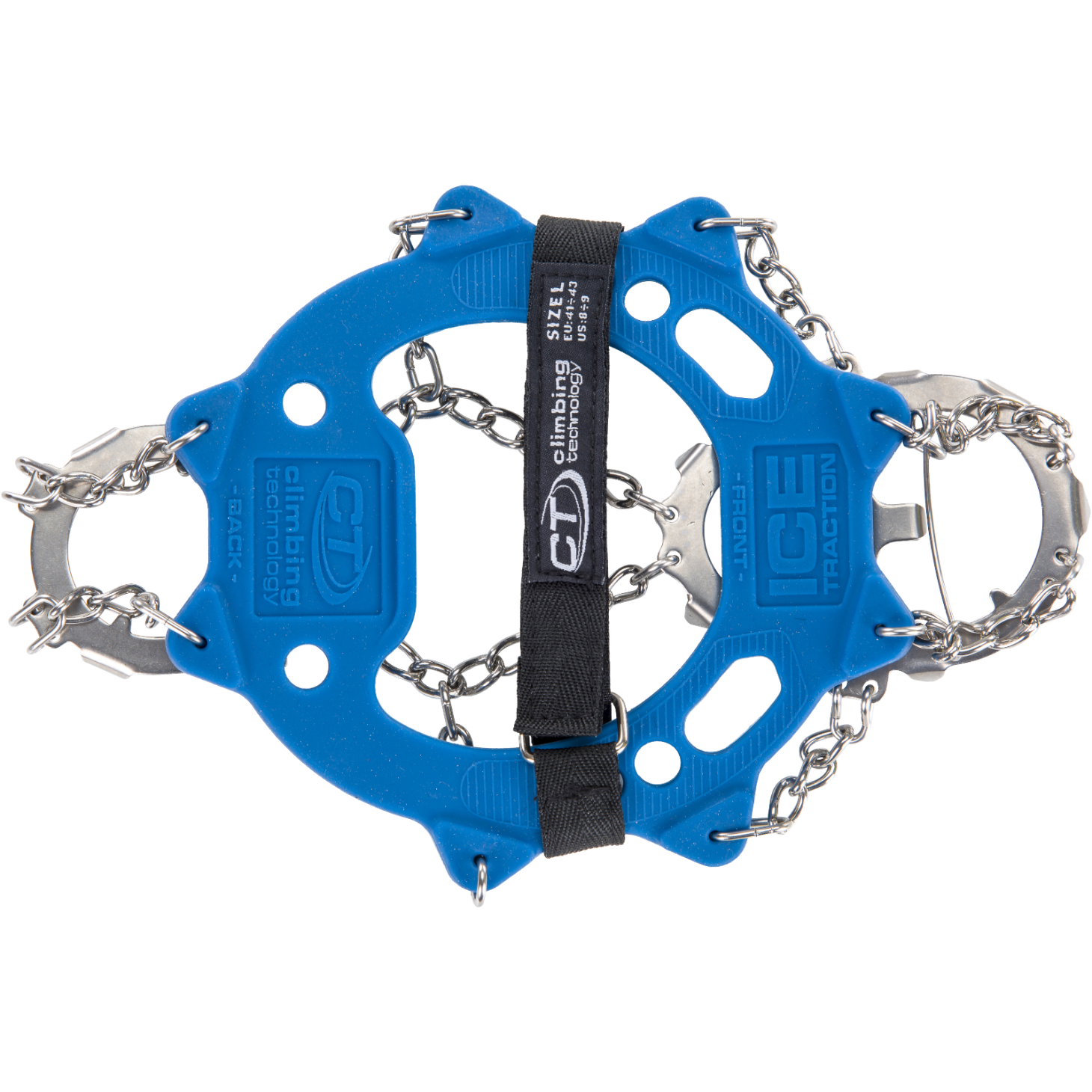 - Befestigungssystem aus elastischem Material, dies sorgt für ein schnelles und stabiles Beschuhen und eignet sich für jeglichen Schuhtyp; die ständige Spannung zwischen Elastomer und Metallteilen sichert ein perfektes Anliegen des Antirutschsystems an der Schuhsohle;